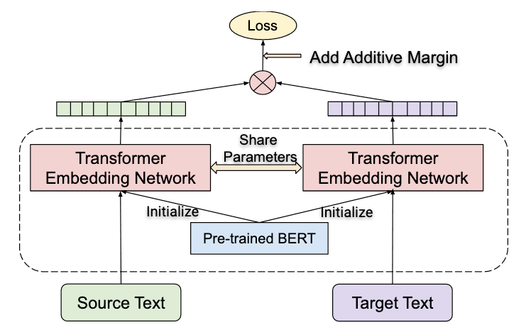 두 분장을 각각 Transformer 모델에 통과시켜 독립적으로 임베딩을 생성하여